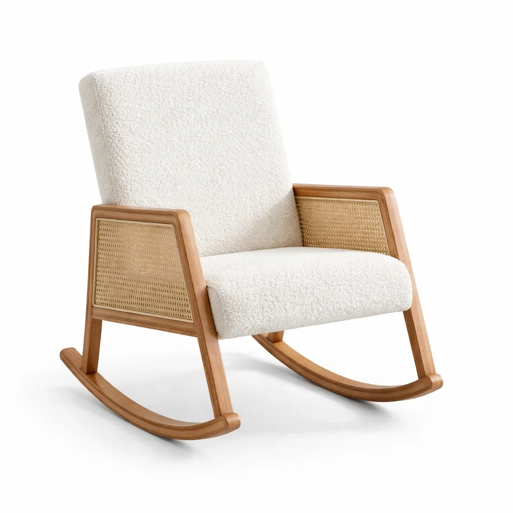 Der Schaukelstuhl besteht aus einem stabilen Holzrahmen mit Rattan-Details. Der Sitz und die Rückenlehne sind mit einem weichen Bouclé-Stoff bezogen.