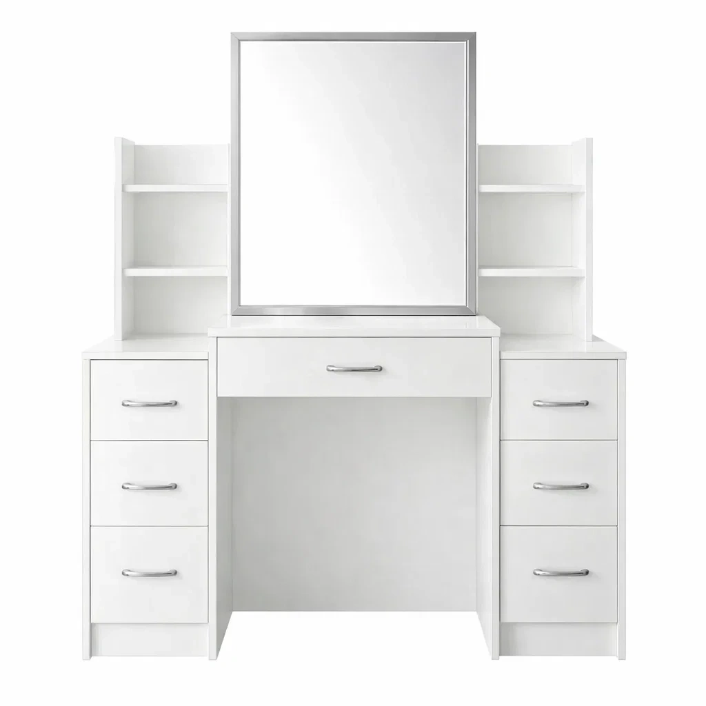 Funktionelle Merkmale: 7 Schubladen; rechteckiger Spiegel aus gehärtetem Glas; 4 offene Regale